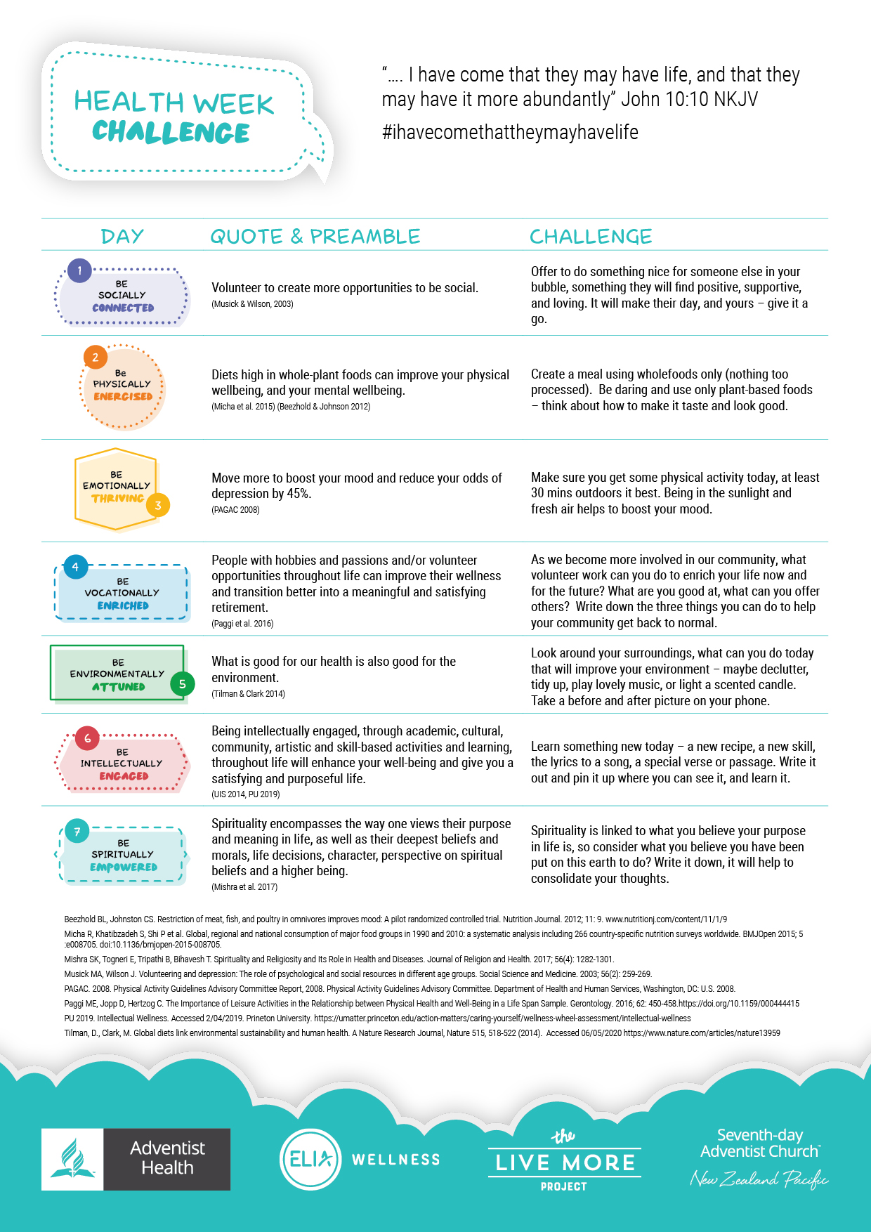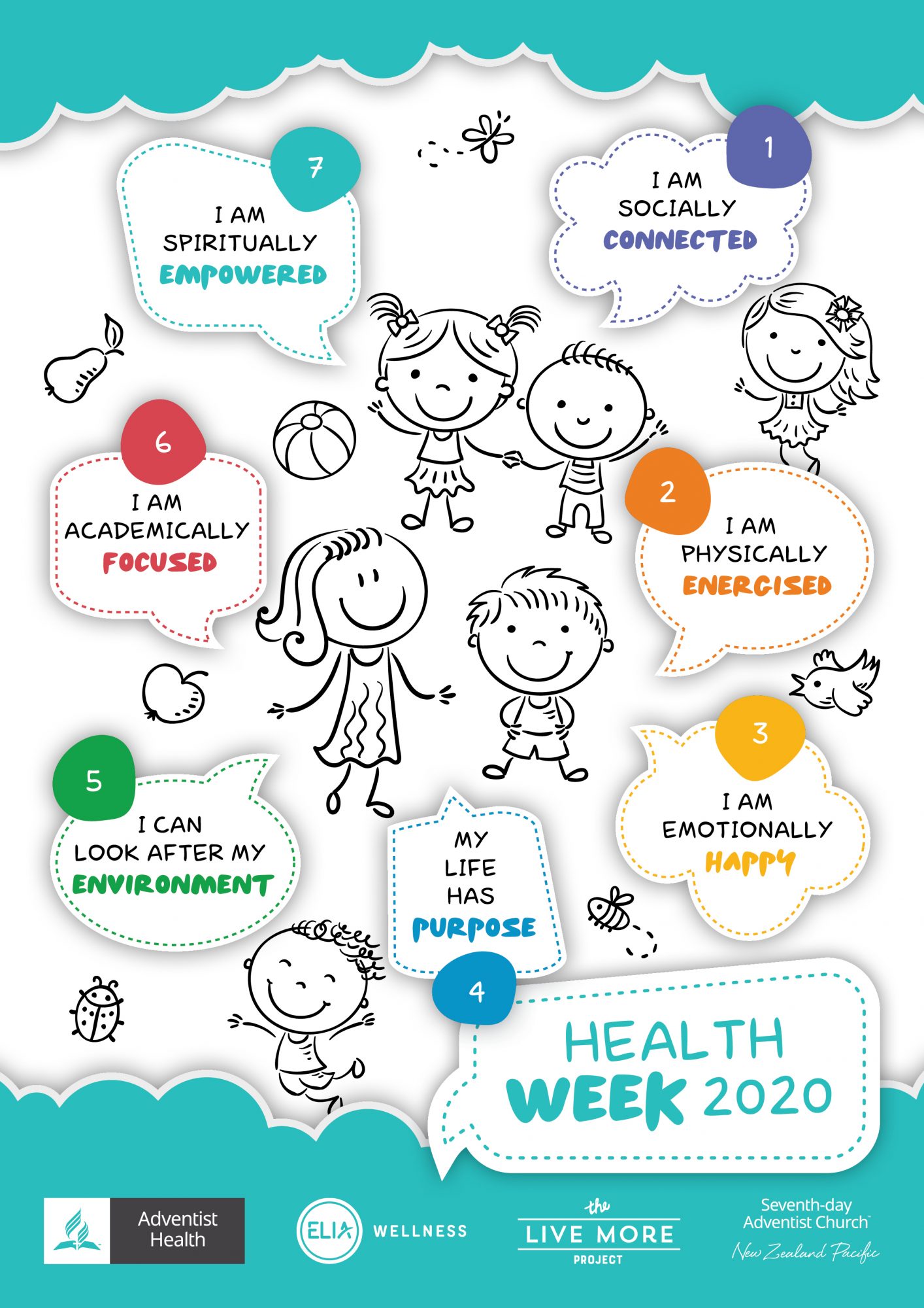 As part of the health week for 2020, Adventist Health Ministries has put together a number of resources for use by the local church. We are attaching a number of files which geared to inspire our children and build resilience in a fun and constructive way. If you look at the illustration, you will notice that there are a number of areas of focus: